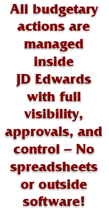 This integrated approach means that from the earliest planning to the final close-out, all budgetary actions are managed inside JD Edwards – with full visibility, approvals, and control.