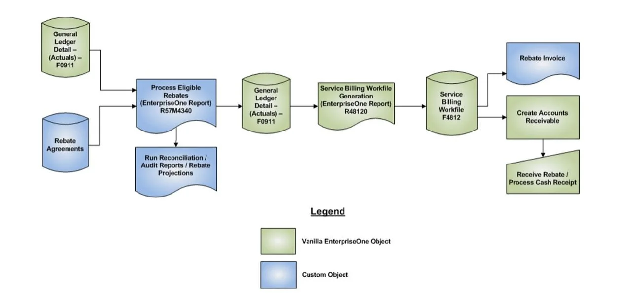 The rebate solution works seamlessly with your current JD Edwards setup requiring a few custom objects that integrate with vanilla EnterpriseOne objects